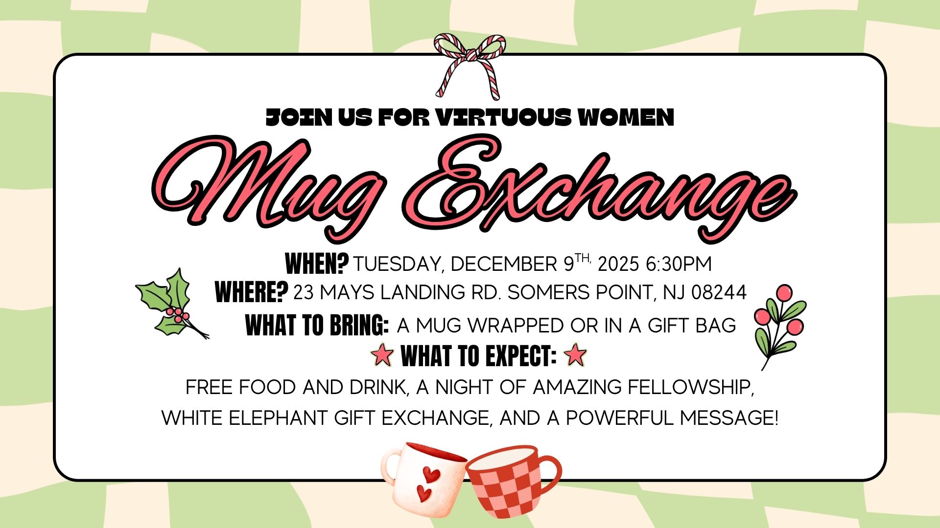 Join Virtuous Women our annual Mug Exchange! Tuesday, December 9th at 6:30PM come for a festive night with free food and drink, amazing fellowship, white elephant mug exchange and a powerful message! Please register at www.houseofmiraclesnj.com/registration